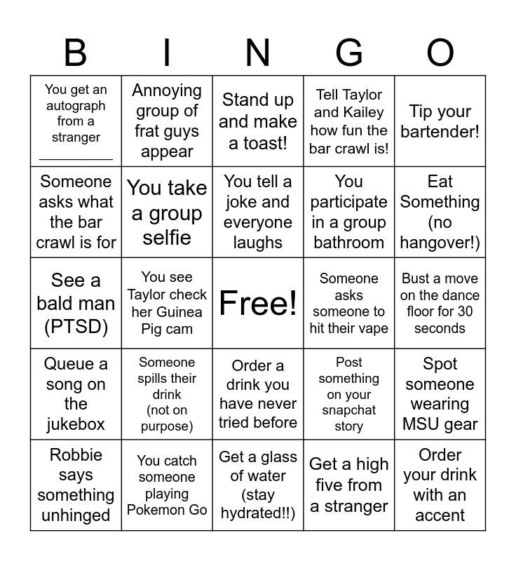 This bingo card has a free space and 29 words: Robbie says something unhinged, You take a shot!, You see Taylor check her Guinea Pig cam, Someone compliments the bar crawl shirts, You get an autograph from a stranger __________, Stand up and make a toast!, You take a group selfie, Someone spills their drink (not on purpose), Someone asks someone to hit their vape, You catch someone playing Pokemon Go, Bust a move on the dance floor for 30 seconds, Order your drink with an accent, Get a glass of water (stay hydrated!!), Get a high five from a stranger, Eat Something (no hangover!), Leave the Dairy Store a 5 star review on Google, Order a drink you have never tried before, Queue a song on the jukebox, Tip your bartender!, See a bald man (PTSD), Post something on your snapchat story, Same song plays more than once, You participate in a group bathroom, Someone asks what the bar crawl is for, Tell Taylor and Kailey how fun the bar crawl is!, Annoying group of frat guys appear, Spot someone wearing MSU gear, You tell a joke and everyone laughs and Win a game of Rock, Paper, Scissors.