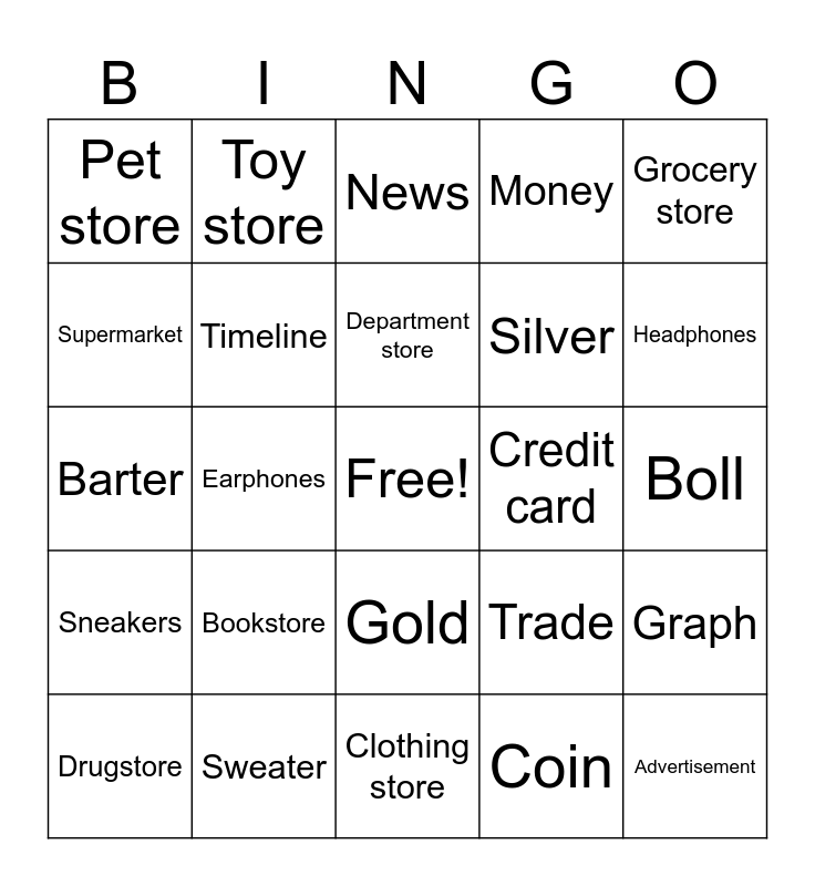 This bingo card has a free space and 25 words: Bookstore, Clothing store, Department store, Drugstore, Grocery store, Pet store, Supermarket, Toy store, Credit card, Gold, Silver, Barter, Trade, Graph, Timeline, Cacao, Boll, News, Headphones, Earphones, Advertisement, Sweater, Sneakers, Money and Coin.