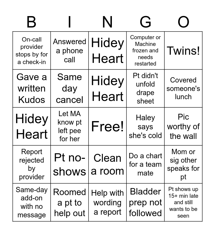 This bingo card has a free space and 24 words: Same-day add-on with no message, Pt no-shows, Hidey Heart, Bladder prep not followed, Twins!, On-call provider stops by for a check-in, Answered a phone call, Hidey Heart, Haley says she's cold, Pic worthy of the wall, Hidey Heart, Same day cancel, Do a chart for a team mate, Mom or sig other speaks for pt, Gave a written Kudos, Roomed a pt to help out, Help with wording a report, Computer or Machine frozen and needs restarted, Covered someone's lunch, Report rejected by provider, Let MA know pt left pee for her, Clean a room, Pt didn't unfold drape sheet and Pt shows up 15+ min late and still wants to be seen.