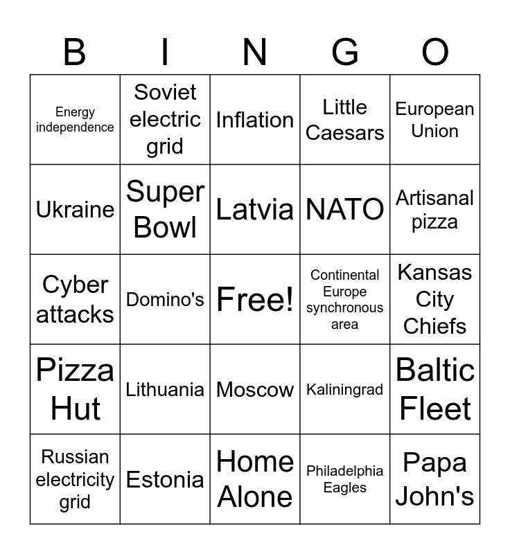 This bingo card has a free space and 24 words: Lithuania, Estonia, Latvia, Russian electricity grid, European Union, Energy independence, Ukraine, Soviet electric grid, Continental Europe synchronous area, Moscow, NATO, Cyber attacks, Kaliningrad, Baltic Fleet, Super Bowl, Philadelphia Eagles, Kansas City Chiefs, Inflation, Artisanal pizza, Domino's, Papa John's, Pizza Hut, Little Caesars and Home Alone.