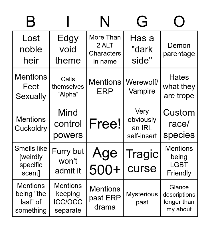 This bingo card has a free space and 26 words: Age 500+, Mysterious past, Mentions ERP, Mentions keeping ICC/OCC separate, Demon parentage, Lost noble heir, Mentions Feet Sexually, Edgy void theme, Custom race/ species, Tragic curse, Werewolf/ Vampire, Mentions Cuckoldry, Mentions being LGBT Friendly, Mentions being "the last" of something, Mind control powers, Godkiller title, Has a "dark side", Smells like [weirdly specific scent], More Than 2 ALT Characters in name, Glance descriptions longer than my about, Hates what they are trope, Mentions past ERP drama, Very obviously an IRL self-insert, Furry but won't admit it, Calls themselves “Alpha” and Overuses ✨weird✨.