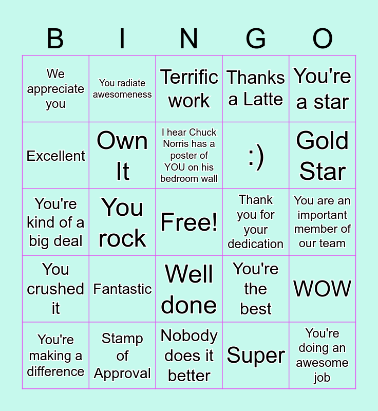 This bingo card has a free space and 31 words: Nobody does it better, You make this a great place to work, You rock, Way to go, We appreciate you, Terrific work, Own It, You're the best, Thank you for your dedication, Super, You are an important member of our team, You're doing an awesome job, Keep up the good work, We couldn't do it without you, Gold Star, High five, WOW, Fantastic, You crushed it, Well done, You're a star, Many thanks, You're making a difference, You radiate awesomeness, :), Excellent, Thanks a Latte, You're kind of a big deal, Stamp of Approval, I hear Chuck Norris has a poster of YOU on his bedroom wall and Simply the best.