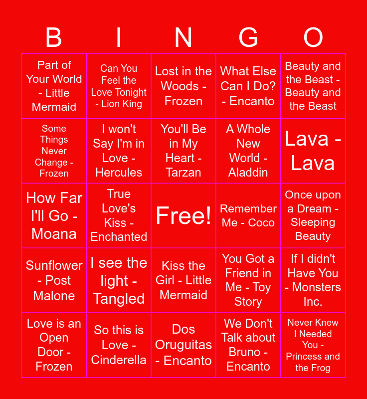 This bingo card has a free space and 24 words: I see the light - Tangled, So this is Love - Cinderella, You'll Be in My Heart - Tarzan, Love is an Open Door - Frozen, Beauty and the Beast - Beauty and the Beast, Part of Your World - Little Mermaid, Some Things Never Change - Frozen, Can You Feel the Love Tonight - Lion King, Remember Me - Coco, Kiss the Girl - Little Mermaid, A Whole New World - Aladdin, How Far I'll Go - Moana, You Got a Friend in Me - Toy Story, If I didn't Have You - Monsters Inc., I won't Say I'm in Love - Hercules, We Don't Talk about Bruno - Encanto, Once upon a Dream - Sleeping Beauty, Lost in the Woods - Frozen, Lava - Lava, True Love's Kiss - Enchanted, Never Knew I Needed You - Princess and the Frog, Sunflower - Post Malone, What Else Can I Do? - Encanto and Dos Oruguitas - Encanto.