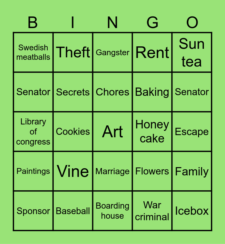 This bingo card has 38 words: Spy, War, Doctor, Secrets, Family, Vine, Chores, Love, Sun tea, Baking, Cookies, Rent, Art, Escape, Senator, Paintings, Value, Gangster, Dog, Honey cake, Swedish meatballs, Baseball, Senator, Sponsor, Immigrants, Boarding house, Icebox, Staircase, Murder, Rent, Engagement ring, Marriage, War criminal, Theft, Lazy eye, Flowers, Library of congress and Secret agent.