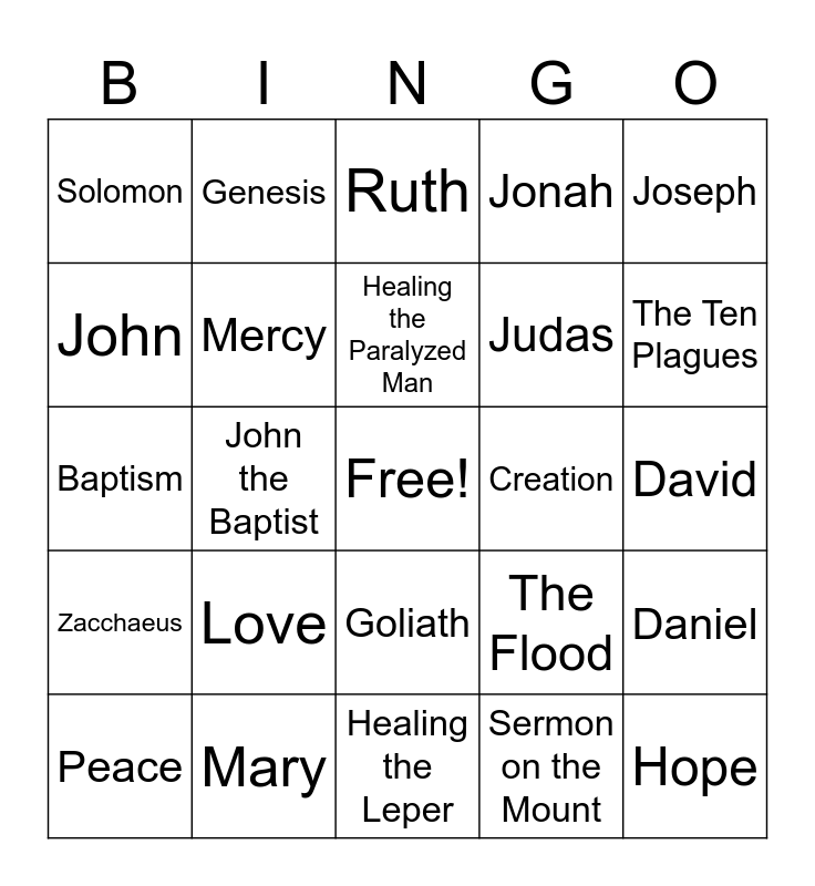 This bingo card has a free space and 70 words: Moses, David, Esther, Paul, Mary, Noah, Jonah, Abraham, Joseph, Peter, Daniel, Elijah, Solomon, Ruth, Samuel, John the Baptist, Goliath, Judas, Adam and Eve, Zacchaeus, Creation, The Flood, The Ten Plagues, Crucifixion, Resurrection, Passover, Pentecost, Exodus, Sermon on the Mount, The Last Supper, Genesis, Psalms, Matthew, Romans, Revelation, Proverbs, Exodus, Luke, Acts, John, Faith, Love, Hope, Forgiveness, Grace, Mercy, Peace, Obedience, Kindness, Patience, Feeding the 5,000, Healing the Blind, Walking on Water, Raising Lazarus, Healing the Leper, Calming the Storm, Healing the Paralyzed Man, Water into Wine, Catching Many Fish, Healing Jairus' Daughter, Baptism, Prayer, Communion, Ten Commandments, The Ark, Golden Calf, Good Samaritan, Prodigal Son, Armor of God and Fruit of the Spirit.