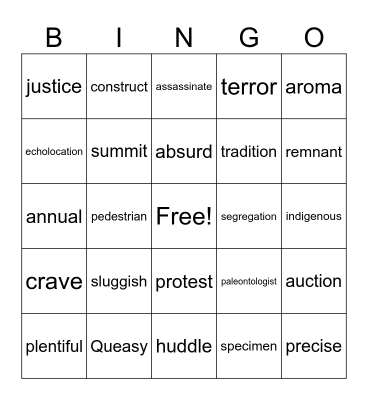 This bingo card has a free space and 31 words: huddle, ample, pedestrian, harvest, justice, assassinate, summit, paleontologist, segregation, specimen, indigenous, precise, national, digest, remnant, racism, auction, sluggish, crave, protest, aroma, century, plentiful, construct, tradition, echolocation, terror, annual, Queasy, absurd and meteorologist.