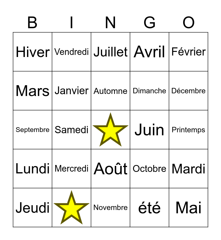 This bingo card has 1 images, a free space and 23 words: Mercredi, Automne, Jeudi, Février, Hiver, Mars, Vendredi, Juin, Août, Dimanche, Septembre, Octobre, Mardi, Janvier, été, Printemps, Juillet, Décembre, Samedi, Mai, Lundi, Avril and Novembre.