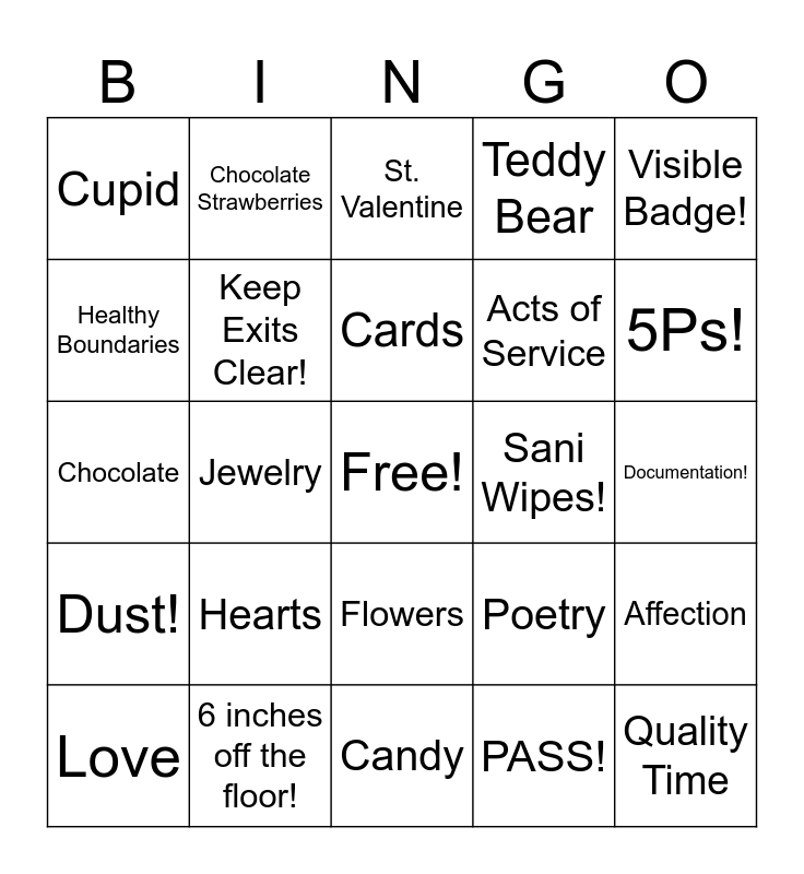 This bingo card has a free space and 29 words: Love, PHI!, Jewelry, XOXO, Cupid, St. Valentine, Keep Exits Clear!, Hearts, Sani Wipes!, 6 inches off the floor!, Documentation!, Quality Time, Candy, PASS!, 5Ps!, Clear Window Sill!, Flowers, Dust!, Visible Badge!, Chocolate, Poetry, Billing!, Acts of Service, Healthy Boundaries, Teddy Bear, Chocolate Strawberries, Affection, Cards and February 14.