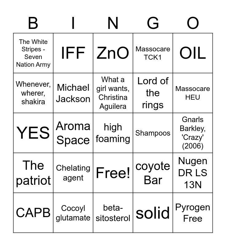 This bingo card has 45 words: medium polar, high foaming, cationic, CAPB, Brightening, solid, ZnO, D5, OIL, Cocoyl glutamate, Massocare TCK1, Shampoos, Free!, Chelating agent, Sun care, beta-sitosterol, NO, YES, Xantham Gum PM80, Massocare HEU, IFF, Gladiator, Britney Spears, ‘Toxic’ (2003), The White Stripes - Seven Nation Army, Amy Winehouse, 'Rehab’ (2006), Gnarls Barkley, 'Crazy' (2006), MATRIX, 0,5-1.5%, coyote Bar, The patriot, 2001, Nugen DR LS 13N, Titanic, Eurovision, Single ladies, Aroma Space, Harry Potter, Megawhite DT, Pyrogen Free, What a girl wants, Christina Aguilera, Whenever, wherer, shakira, Lord of the rings, colour, Michael Jackson and 2023.