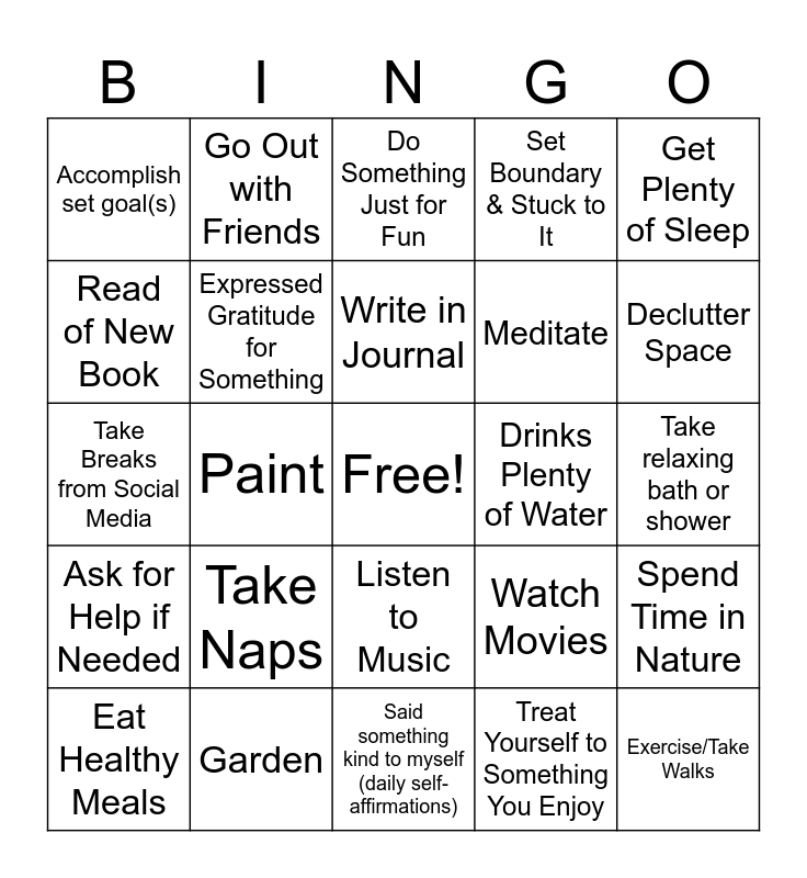 This bingo card has a free space and 24 words: Take Naps, Garden, Write in Journal, Eat Healthy Meals, Get Plenty of Sleep, Accomplish set goal(s), Read of New Book, Go Out with Friends, Drinks Plenty of Water, Listen to Music, Meditate, Take Breaks from Social Media, Watch Movies, Spend Time in Nature, Expressed Gratitude for Something, Treat Yourself to Something You Enjoy, Take relaxing bath or shower, Do Something Just for Fun, Declutter Space, Paint, Exercise/Take Walks, Ask for Help if Needed, Set Boundary & Stuck to It and Said something kind to myself (daily self-affirmations).