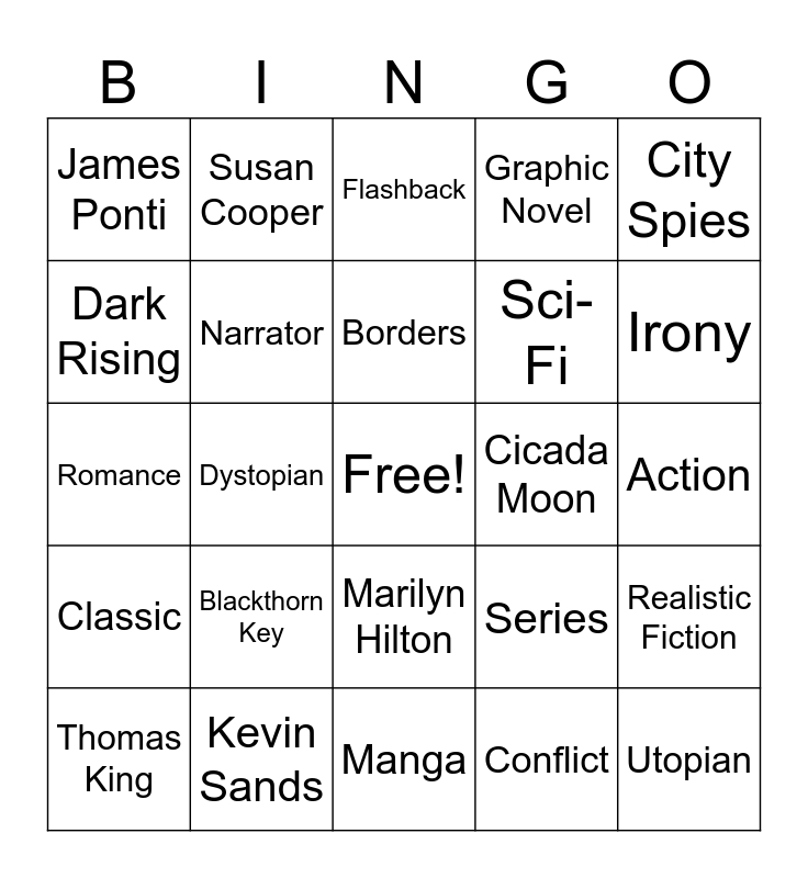 This bingo card has a free space and 24 words: Blackthorn Key, Kevin Sands, Borders, Thomas King, City Spies, James Ponti, Dark Rising, Susan Cooper, Cicada Moon, Marilyn Hilton, Sci-Fi, Romance, Series, Realistic Fiction, Narrator, Conflict, Action, Flashback, Irony, Dystopian, Utopian, Classic, Graphic Novel and Manga.