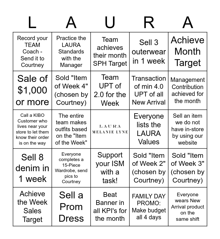 This bingo card has a free space and 24 words: Everyone completes a 15-Piece Wardrobe, send pics to Courtney, Sell a Prom Dress, Team UPT of 2.0 for the Week, Achieve the Week Sales Target, Achieve Month Target, Record your TEAM Coach - Send it to Courtney, Sale of $1,000 or more, Practice the LAURA Standards with the Manager, Everyone lists the LAURA Values, Support your ISM with a task!, Transaction of min 4.0 UPT of all New Arrival, Call a KIBO Customer who lives near your store to let them know their order is on the way, Sold "Item of Week 2" (chosen by Courtney), Sold "Item of Week 3" (chosen by Courtney), Sold "Item of Week 4" (chosen by Courtney), FAMILY DAY PROMO: Make budget all 4 days, Sell an item we do not have in-store by using our website, Team achieves their month SPH Target, Management Contribution achieved for the month, The entire team makes outfits based on the "Item of the Week", Everyone wears New Arrival product on the same shift, Sell 8 denim in 1 week, Sell 3 outerwear in 1 week and Beat Banner in all KPI's for the month.