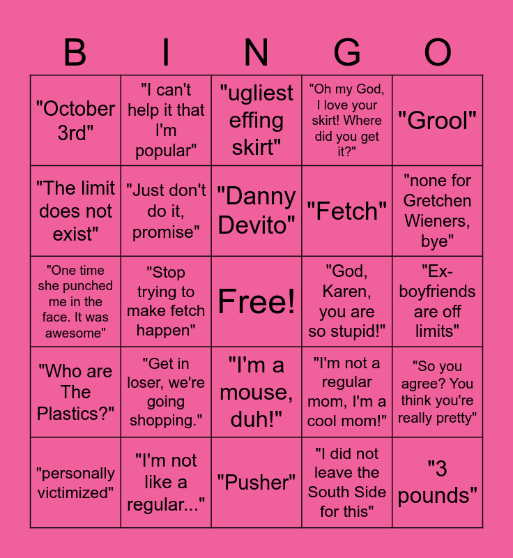 This bingo card has a free space and 29 words: "personally victimized", "ESPN", "Stop trying to make fetch happen", "Brutus is just as cute as Caesar", "October 3rd", "ugliest effing skirt", "Just don't do it, promise", "Get in loser, we're going shopping.", "God, Karen, you are so stupid!", "I'm not like a regular...", "Ex-boyfriends are off limits", "3 pounds", "Pusher", "I did not leave the South Side for this", "none for Gretchen Wieners, bye", "Shut up! Shut up! I didn't say anything", "I'm a mouse, duh!", "Who are The Plastics?", "Grool", "One time she punched me in the face. It was awesome", "I'm not a regular mom, I'm a cool mom!", "She doesn't even go here", "Fetch", "The limit does not exist", "Oh my God, I love your skirt! Where did you get it?", "I can't help it that I'm popular", "So you agree? You think you're really pretty", "Danny Devito" and "It's full of secrets".