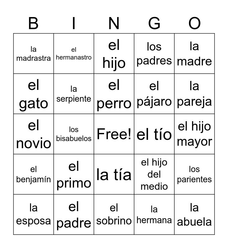 This bingo card has a free space and 45 words: el abuelo, la abuela, el esposo, la esposa, el hermano, la hermana, el hijo, la hija, la madre, el padre, los padres, el tío, la tía, el primo, la prima, el sobrino, la sobrina, el novio, la novia, la pareja, el hermanastro, la hermanastra, el padrastro, la madrastra, casado, el hijo mayor, el hijo menor, el hijo único, el hijo del medio, el benjamín, el medio hermano, los parientes, divorciado, la mujer, el hombre, los bisabuelos, los bisnietos, el tío abuelo, las mascotas, el perro, el gato, el pájaro, la lagartija, la serpiente and la tortuga.
