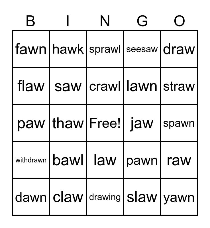 This bingo card has a free space and 24 words: bawl, claw, crawl, dawn, draw, fawn, flaw, hawk, jaw, law, lawn, paw, pawn, raw, saw, slaw, spawn, sprawl, straw, thaw, yawn, withdrawn, seesaw and drawing.