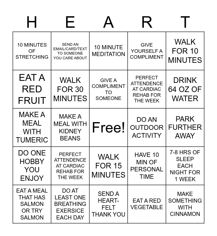 This bingo card has a free space and 24 words: EAT A MEAL THAT HAS SALMON OR TRY SALMON, PERFECT ATTENDENCE AT CARDIAC REHAB FOR THE WEEK, GIVE A COMPLIMENT TO SOMEONE, EAT A RED VEGETABLE, WALK FOR 10 MINUTES, 10 MINUTES OF STRETCHING, SEND AN EMAIL/CARD/TEXT TO SOMEONE YOU CARE ABOUT, 10 MINUTE MEDITATION, DO AN OUTDOOR ACTIVITY, PARK FURTHER AWAY, MAKE A MEAL WITH TUMERIC, WALK FOR 30 MINUTES, HAVE 10 MIN OF PERSONAL TIME, 7-8 HRS OF SLEEP EACH NIGHT FOR 1 WEEK, EAT A RED FRUIT, DO AT LEAST ONE BREATHING EXERSICE EACH DAY, SEND A HEART-FELT THANK YOU, GIVE YOURSELF A COMPLIMENT, DRINK 64 OZ OF WATER, DO ONE HOBBY YOU ENJOY, MAKE A MEAL WITH KIDNEY BEANS, WALK FOR 15 MINUTES, PERFECT ATTENDENCE AT CARDIAC REHAB FOR THE WEEK and MAKE SOMETHING WITH CINNAMON.