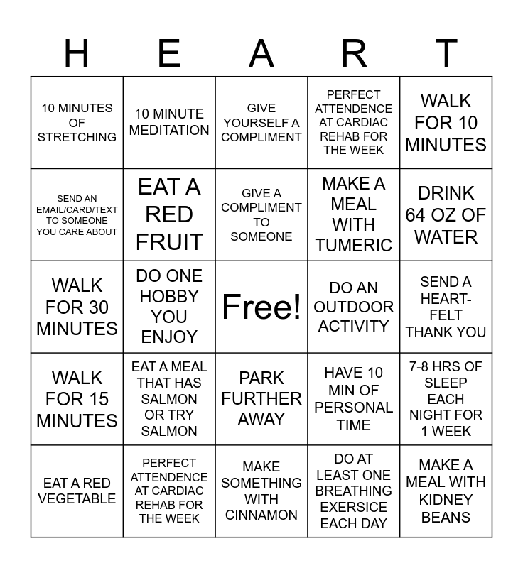 This bingo card has a free space and 24 words: EAT A MEAL THAT HAS SALMON OR TRY SALMON, PERFECT ATTENDENCE AT CARDIAC REHAB FOR THE WEEK, GIVE A COMPLIMENT TO SOMEONE, EAT A RED VEGETABLE, WALK FOR 10 MINUTES, 10 MINUTES OF STRETCHING, SEND AN EMAIL/CARD/TEXT TO SOMEONE YOU CARE ABOUT, 10 MINUTE MEDITATION, DO AN OUTDOOR ACTIVITY, PARK FURTHER AWAY, MAKE A MEAL WITH TUMERIC, WALK FOR 30 MINUTES, HAVE 10 MIN OF PERSONAL TIME, 7-8 HRS OF SLEEP EACH NIGHT FOR 1 WEEK, EAT A RED FRUIT, DO AT LEAST ONE BREATHING EXERSICE EACH DAY, SEND A HEART-FELT THANK YOU, GIVE YOURSELF A COMPLIMENT, DRINK 64 OZ OF WATER, DO ONE HOBBY YOU ENJOY, MAKE A MEAL WITH KIDNEY BEANS, WALK FOR 15 MINUTES, PERFECT ATTENDENCE AT CARDIAC REHAB FOR THE WEEK and MAKE SOMETHING WITH CINNAMON.