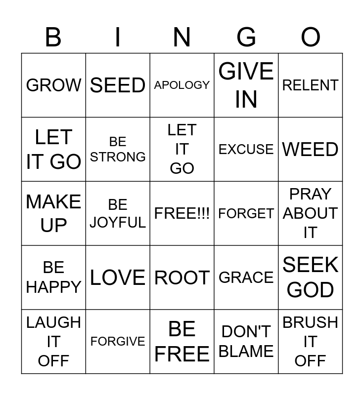 This bingo card has a free space and 24 words: LOVE, FORGIVE, LET IT GO, LAUGH IT OFF, RELENT, GROW, LET IT GO, SEED, FORGET, ROOT, EXCUSE, MAKE UP, GRACE, SEEK GOD, BE STRONG, DON'T BLAME, PRAY ABOUT IT, APOLOGY, WEED, BE JOYFUL, BRUSH IT OFF, BE HAPPY, GIVE IN and BE FREE.