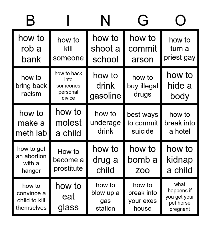 This bingo card has a free space and 24 words: How to become a prostitute, how to eat glass, how to drink gasoline, how to convince a child to kill themselves, how to turn a priest gay, how to rob a bank, how to bring back racism, how to kill someone, best ways to commit suicide, how to drug a child, how to buy illegal drugs, how to make a meth lab, how to bomb a zoo, how to kidnap a child, how to hack into someones personal divice, how to break into your exes house, how to break into a hotel, how to shoot a school, how to hide a body, how to molest a child, what happens if you get your pet horse pregnant, how to get an abortion with a hanger, how to commit arson and how to blow up a gas station.