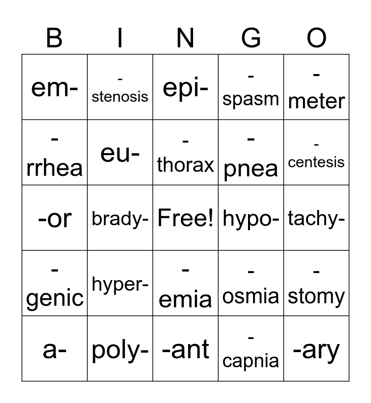 This bingo card has a free space and 29 words: a-, anti-, brady-, dys-, em-, epi-, eu-, hyper-, hypo-, poly-, tachy-, -ary, -ant, -capnia, -centesis, -ectasis, -emia, -genic, -meter, -or, -osmia, -phonia, -pnea, -rrhea, -spasm, -stenosis, -stomy, -thorax and -tomy.