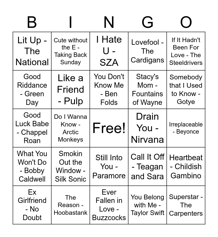 This bingo card has a free space and 40 words: Thinkin Bout You - Frank Ocean, Good Luck Babe - Chappel Roan, Valerie - The Weeknd, Like a Friend - Pulp, The Reason - Hoobastank, Still Into You - Paramore, You Don't Know Me - Ben Folds, Suckers Prayer - The Decemberists, If It Hadn't Been For Love - The Steeldrivers, What You Won't Do - Bobby Caldwell, Do I Wanna Know - Arctic Monkeys, Lovefool - The Cardigans, Superstar - The Carpenters, Irreplaceable - Beyonce, Drain You - Nirvana, Smokin Out the Window - Silk Sonic, Song of Our So Called Friend - Okkervil River, Lit Up - The National, Forget You - CeeLo Green, I Hate U - SZA, Heartbeat - Childish Gambino, You Belong with Me - Taylor Swift, Stacy's Mom - Fountains of Wayne, Good Riddance - Green Day, How Soon is Now - The Smiths, The Denial Twist - The White Stripes, This Life - Vampire Weekend, Funny You Should Ask - Front Bottoms, You Oughta Know - Alanis Morisette, Torn - Natalie Imbruglia, Don't Speak - No Doubt, Ex Girlfriend - No Doubt, Mr Brightside - The Killers, Call It Off - Teagan and Sara, Somebody that I Used to Know - Gotye, Ever Fallen in Love - Buzzcocks, Love Will Tear Us Apart - Joy Division, Bizarre Love Triangle - New Order, Cute without the E - Taking Back Sunday and I Hope Your Husband Dies - Amigo the Devil.