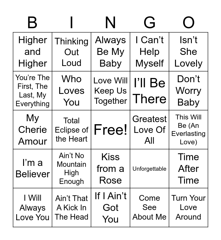 This bingo card has a free space and 78 words: At Last, Let’s Stay Together, Always Be My Baby, Silly Love Songs, A Natural Woman, For Once In My Life, Just the Way You Are (Billy Joel), You Are the Sunshine of My Life, Where Is The Love, You’re All I Need To Get By, My Guy, Baby Love, I Can’t Help Myself, Higher and Higher, When a Man Loves a Woman, You’re The First, The Last, My Everything, It’s Not Unusual, Ain’t No Mountain High Enough, My Girl, This Will Be (An Everlasting Love), You Make Me Feel Like Dancing, Isn’t She Lovely, My Cherie Amour, Love Will Keep Us Together, Who Loves You, You’re Still The One, More Than Words, I Want to Know What Love Is, God Only Knows, Our House, Don’t Worry Baby, Love on Top, If I Ain’t Got You, I Have Nothing, I Will Always Love You, Greatest Love Of All, Real Love, Every Little Thing I Do, Sweet Love, Turn Your Love Around, You Make Me Feel Brand New, Saving All My Love for You, All of Me, Marry You, Just the Way You Are (Bruno Mars), Thinking Out Loud, Like I’m Gonna Lose You, A Thousand Years, Better Together, Unchained Melody, Time After Time, Total Eclipse of the Heart, Unforgettable, Can You Feel The Love Tonight, Killing Me Softly With His Song, When You Say Nothing At All, Have I Told You Lately, How Sweet It Is, Love Me Tender, Kiss from a Rose, I’ll Be There, I Can’t Help Falling In Love With You, The Way You Look Tonight, I Swear, How Am I Supposed to Live Without You, I Knew I Loved You, Save The Best for Last, All Out Of Love, I’m a Believer, Ain’t That A Kick In The Head, The Best Of My Love, How Will I Know, L-O-V-E, Build Me Up Buttercup, Come See About Me, Right Back To Where We Started From, Don’t Go Breaking My Heart and Got To Be Real.