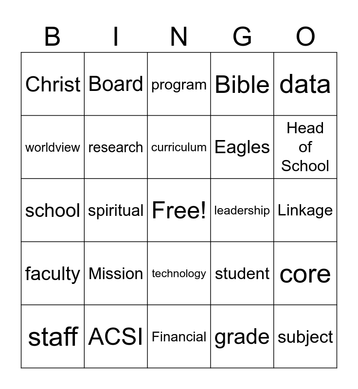 This bingo card has a free space and 35 words: Instruction, learner, teaching/teacher, research, technology, Bible, worldview, Christian, curriculum, standard, school, data, assessment, employee, Christ, leadership, grade, spiritual, faculty, subject, student, staff, core, ACSI, program, Head of School, Carver, Elders, Eagles, Linkage, Strategic, Financial, Mission, Board and Conflicts.