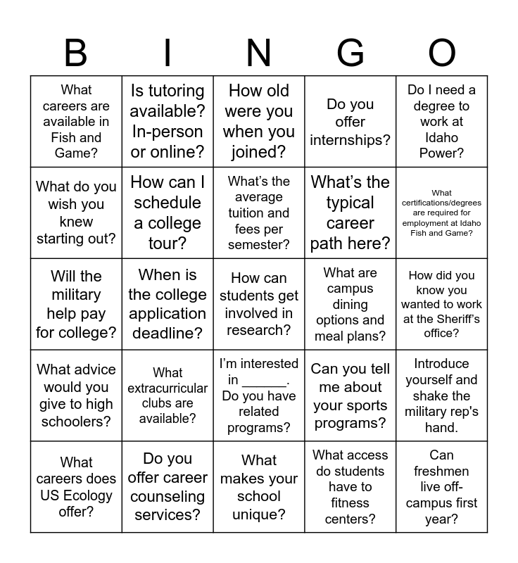 This bingo card has 32 words: What access do students have to fitness centers?, What steps did you take to get into your career?, When is the college application deadline?, What’s the average freshman class size at your college?, What advice would you give to high schoolers?, How can I schedule a college tour?, Do I need a degree to work at Idaho Power?, Introduce yourself and shake the military rep's hand., Is tutoring available? In-person or online?, Can freshmen live off-campus first year?, What’s the average tuition and fees per semester?, How old were you when you joined?, Does this school require an essay for admission?, What job opportunities are available at Idaho Power?, What are campus dining options and meal plans?, What do you like most about your job?, What careers does US Ecology offer?, Will the military help pay for college?, I’m interested in ______. Do you have related programs?, What extracurricular clubs are available?, Can you tell me about your sports programs?, How many hours do students study each week?, How did you know you wanted to work at the Sheriff’s office?, Do you offer career counseling services?, How can students get involved in research?, Do you offer internships?, What’s the typical career path here?, What do you wish you knew starting out?, What careers are available in Fish and Game?, What makes your school unique?, What are typical entry-level positions in your field? and What certifications/degrees are required for employment at Idaho Fish and Game?.