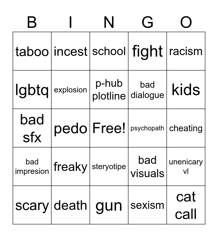 This bingo card has a free space and 24 words: freaky, death, p-hub plotline, scary, racism, taboo, lgbtq, incest, psychopath, steryotipe, bad dialogue, bad sfx, bad visuals, unenicary vl, explosion, sexism, cheating, school, kids, pedo, cat call, bad impresion, fight and gun.