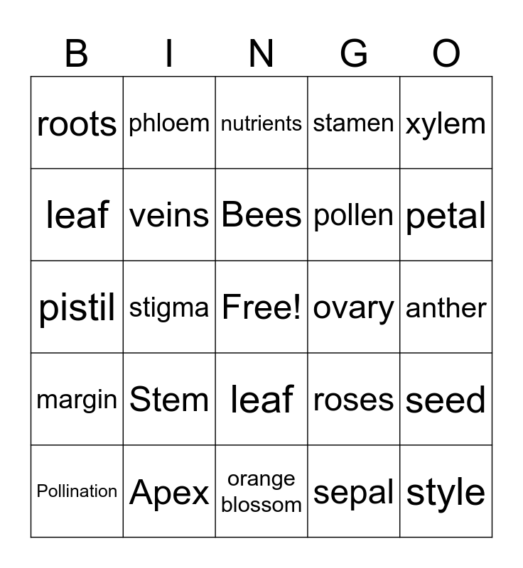This bingo card has a free space and 24 words: Stem, Apex, Bees, Pollination, xylem, roots, leaf, phloem, ovary, leaf, pollen, pistil, roses, seed, veins, sepal, anther, nutrients, petal, stigma, style, margin, stamen and orange blossom.