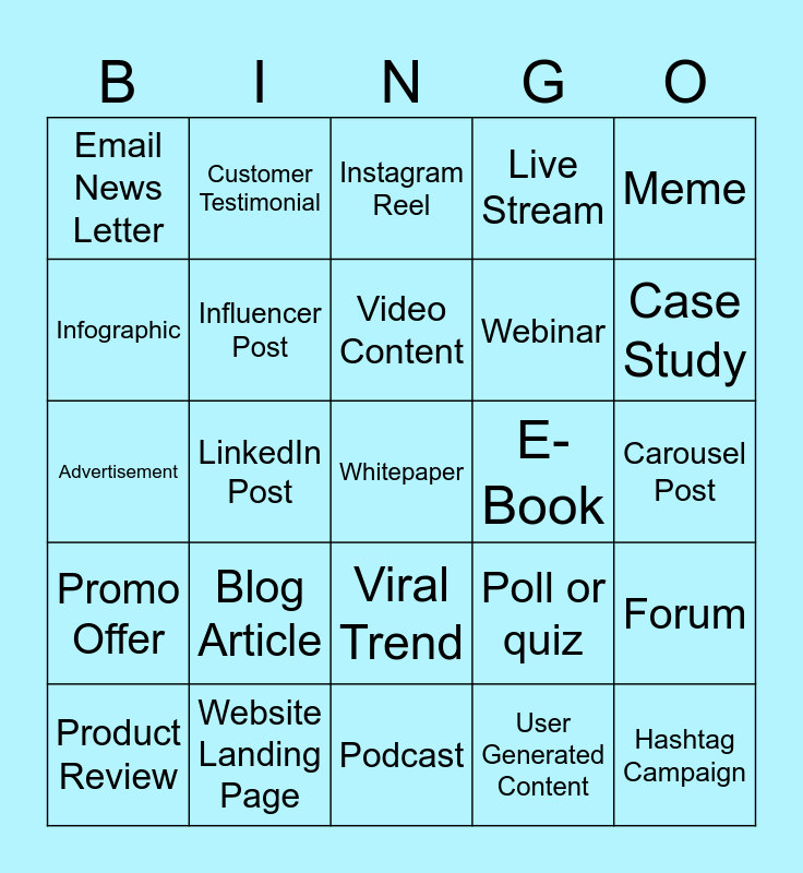 This bingo card has 25 words: Blog Article, Podcast, Video Content, Product Review, Meme, Email News Letter, Infographic, Customer Testimonial, E-Book, Viral Trend, Webinar, Advertisement, Poll or quiz, Forum, Influencer Post, Hashtag Campaign, Carousel Post, Instagram Reel, Case Study, LinkedIn Post, Whitepaper, Website Landing Page, Promo Offer, Live Stream and User Generated Content.