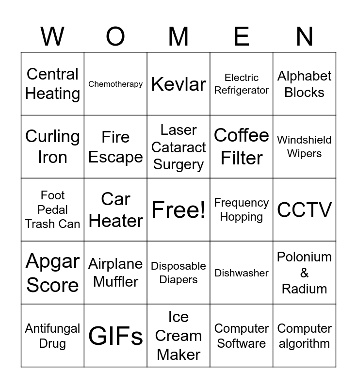 This bingo card has a free space and 31 words: Ice Cream Maker, Life Raft, Car Heater, Medical Syringe, Central Heating, Kevlar, Fire Escape, Dishwasher, Frequency Hopping, Computer Software, CCTV, Computer algorithm, Stem Cell Isolation, Caller ID, Windshield Wipers, Circular Saw, Polonium & Radium, Airplane Muffler, Apgar Score, Disposable Diapers, Alphabet Blocks, Aquarium, Antifungal Drug, Chemotherapy, Coffee Filter, Curling Iron, Electric Refrigerator, Foot Pedal Trash Can, GIFs, Laser Cataract Surgery and Molecular Sieves.