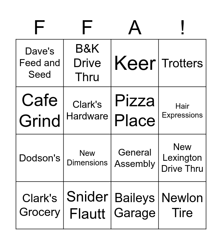 This bingo card has 17 words: Baileys Garage, Clark's Grocery, Keer, Dave's Feed and Seed, New Dimensions, Trotters, New Lexington Drive Thru, Pizza Place, Hair Expressions, Clark's Hardware, Snider Flautt, General Assembly, Cafe Grind, B&K Drive Thru, Dodson's, Creno's and Newlon Tire.