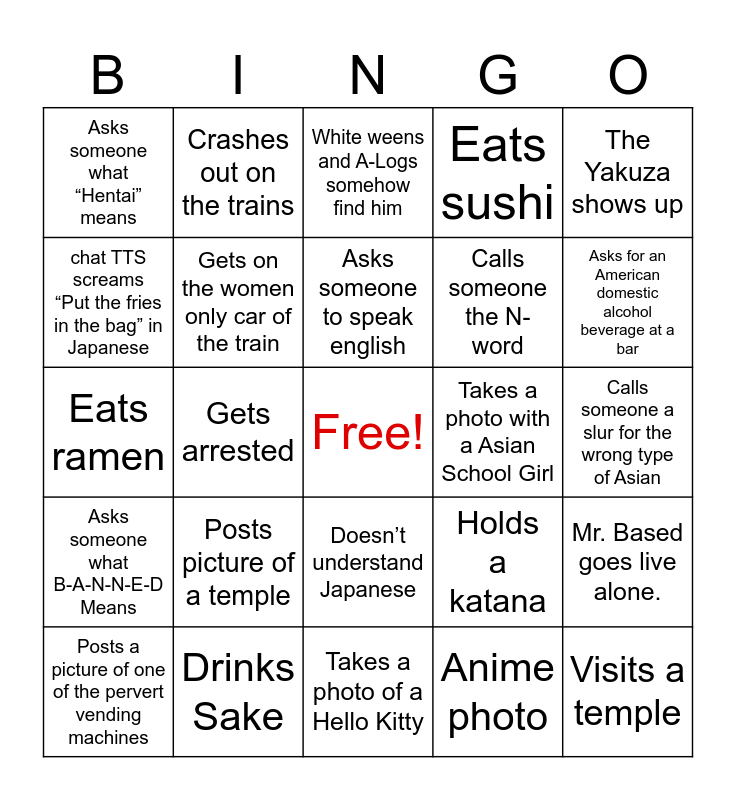 This bingo card has a free space and 24 words: Posts picture of a temple, Drinks Sake, Asks someone to speak english, Posts a picture of one of the pervert vending machines, The Yakuza shows up, Asks someone what “Hentai” means, chat TTS screams “Put the fries in the bag” in Japanese, Crashes out on the trains, Takes a photo with a Asian School Girl, Doesn’t understand Japanese, Calls someone the N-word, Eats ramen, Holds a katana, Mr. Based goes live alone., Gets on the women only car of the train, Anime photo, Calls someone a slur for the wrong type of Asian, White weens and A-Logs somehow find him, Asks for an American domestic alcohol beverage at a bar, Gets arrested, Visits a temple, Asks someone what B-A-N-N-E-D Means, Eats sushi and Takes a photo of a Hello Kitty.