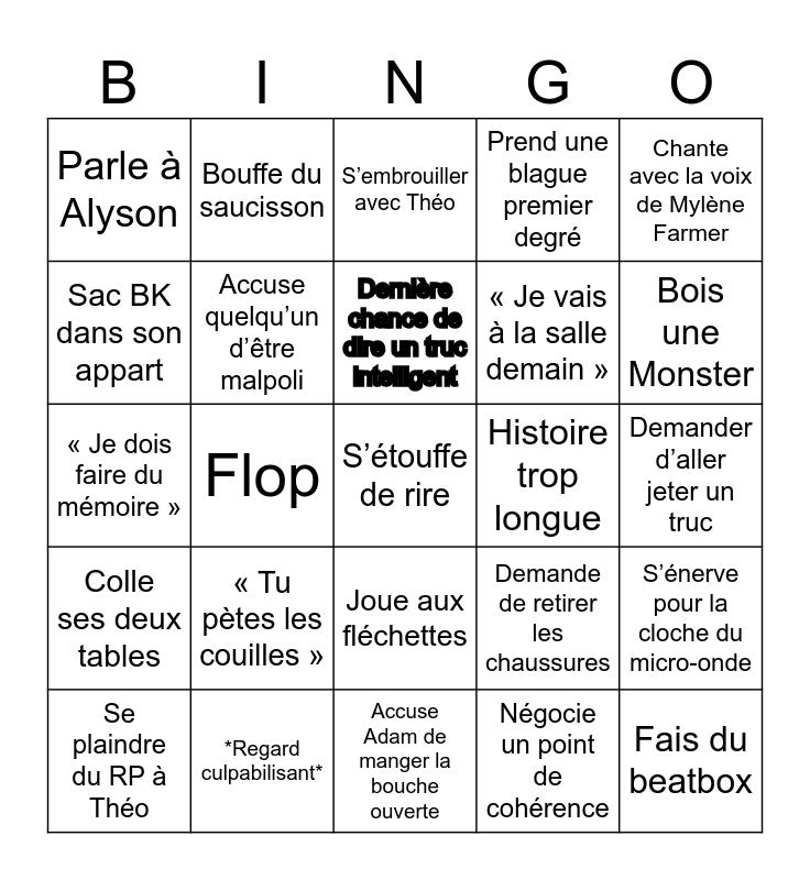 This bingo card has a free space and 24 words: « Tu pètes les couilles », *Regard culpabilisant*, Dernière chance de dire un truc intelligent, Se plaindre du RP à Théo, Chante avec la voix de Mylène Farmer, Parle à Alyson, Sac BK dans son appart, Bouffe du saucisson, Histoire trop longue, Joue aux fléchettes, « Je vais à la salle demain », « Je dois faire du mémoire », Demande de retirer les chaussures, S’énerve pour la cloche du micro-onde, Accuse quelqu’un d’être malpoli, Négocie un point de cohérence, Demander d’aller jeter un truc, S’embrouiller avec Théo, Bois une Monster, Flop, Fais du beatbox, Colle ses deux tables, Prend une blague premier degré and Accuse Adam de manger la bouche ouverte.