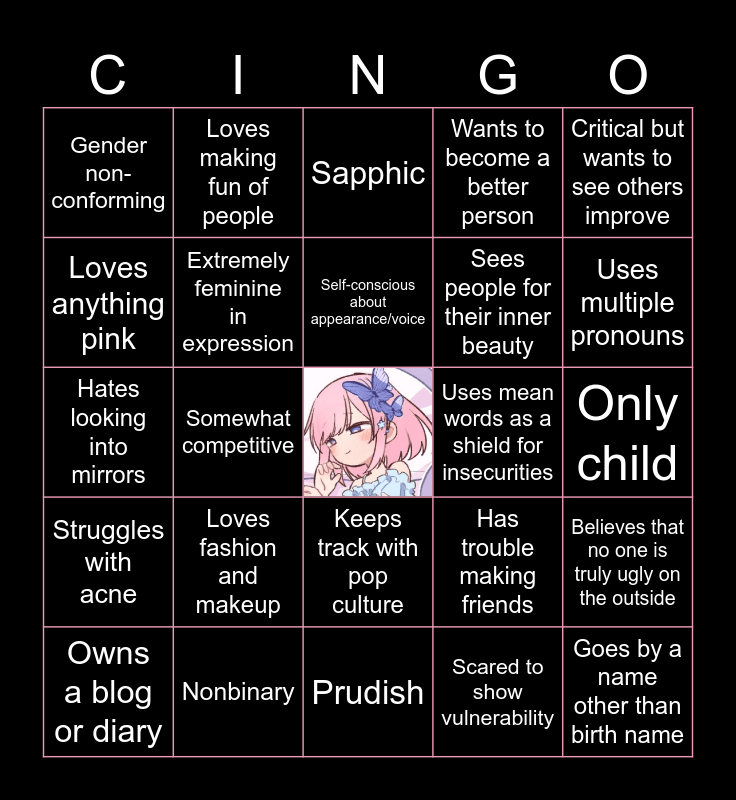 This bingo card has a free space and 24 words: Loves fashion and makeup, Nonbinary, Self-conscious about appearance/voice, Owns a blog or diary, Critical but wants to see others improve, Gender non-conforming, Loves anything pink, Loves making fun of people, Uses mean words as a shield for insecurities, Keeps track with pop culture, Sees people for their inner beauty, Hates looking into mirrors, Has trouble making friends, Believes that no one is truly ugly on the outside, Extremely feminine in expression, Scared to show vulnerability, Only child, Sapphic, Uses multiple pronouns, Somewhat competitive, Goes by a name other than birth name, Struggles with acne, Wants to become a better person and Prudish.