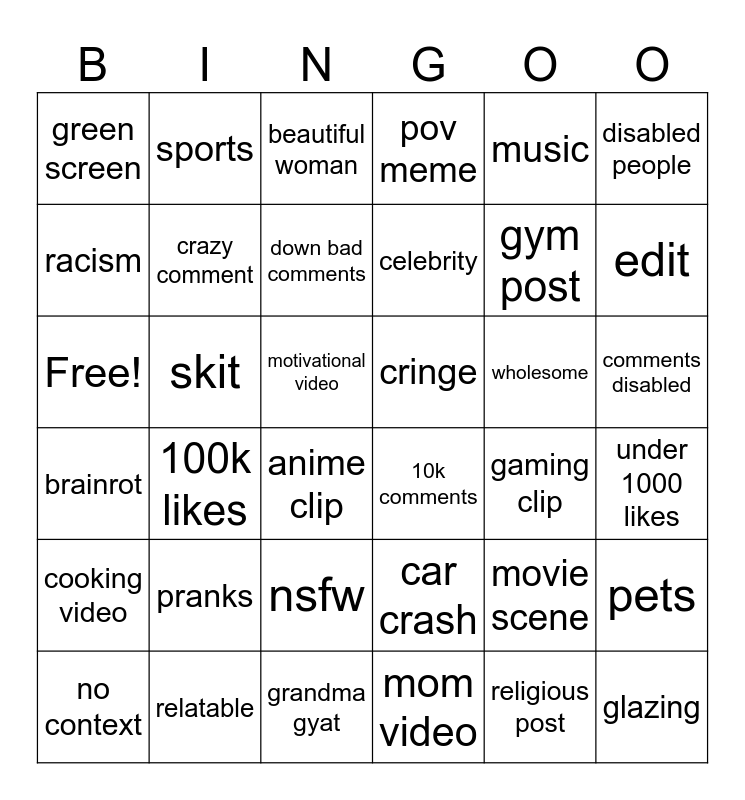 This bingo card has 36 words: car crash, nsfw, mom video, racism, brainrot, cringe, crazy comment, grandma gyat, music, movie scene, edit, pov meme, pets, skit, celebrity, green screen, cooking video, wholesome, Free!, beautiful woman, motivational video, 100k likes, 10k comments, anime clip, gaming clip, sports, gym post, relatable, down bad comments, disabled people, glazing, no context, under 1000 likes, comments disabled, pranks and religious post.
