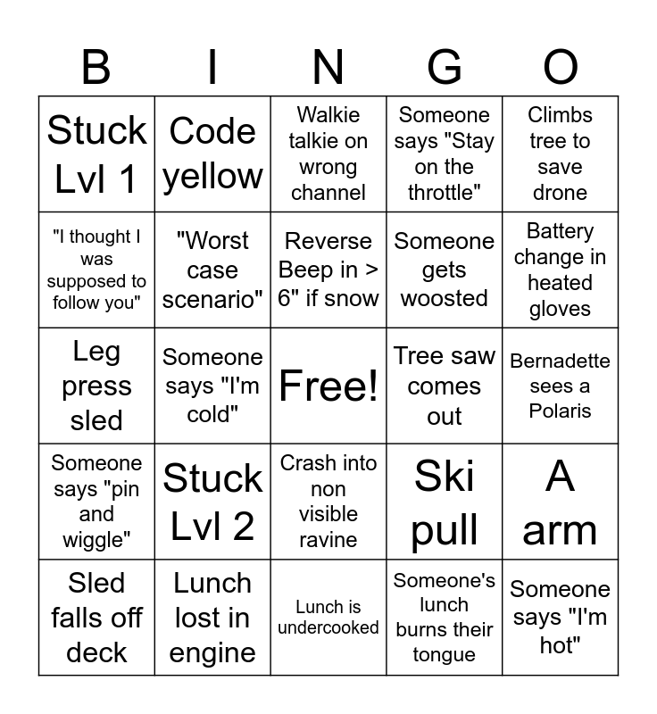 This bingo card has a free space and 24 words: Stuck Lvl 2, Lunch lost in engine, Reverse Beep in > 6" if snow, Sled falls off deck, Climbs tree to save drone, Stuck Lvl 1, "I thought I was supposed to follow you", Code yellow, Tree saw comes out, Crash into non visible ravine, Someone gets woosted, Leg press sled, Ski pull, A arm, "Worst case scenario", Someone's lunch burns their tongue, Bernadette sees a Polaris, Walkie talkie on wrong channel, Battery change in heated gloves, Someone says "I'm cold", Someone says "I'm hot", Someone says "pin and wiggle", Someone says "Stay on the throttle" and Lunch is undercooked.