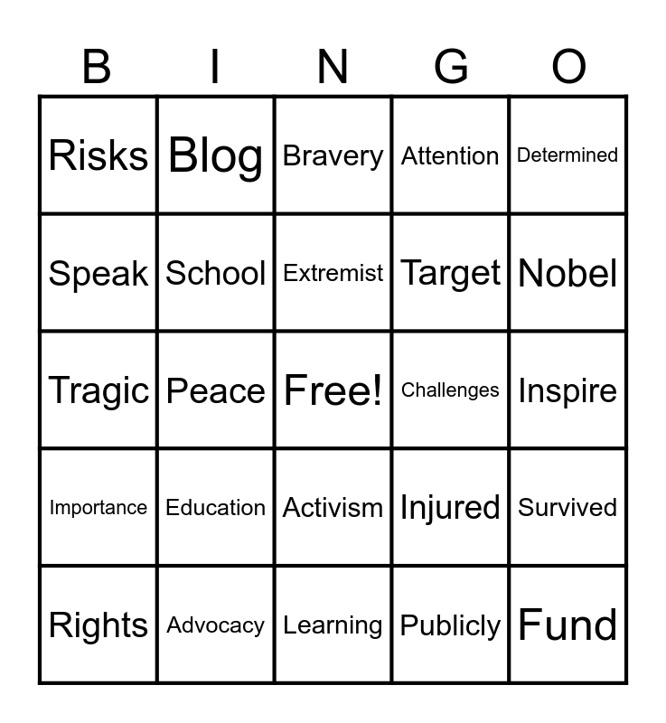 This bingo card has a free space and 25 words: Education, Learning, Extremist, Rights, Determined, Risks, Speak, Blog, Challenges, Activism, Target, Tragic, Injured, Survived, School, Organization, Inspire, Bravery, Nobel, Peace, Fund, Advocacy, Importance, Attention and Publicly.