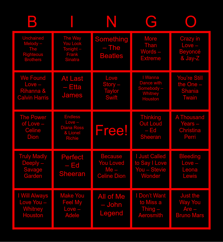 This bingo card has a free space and 29 words: I Will Always Love You – Whitney Houston, My Heart Will Go On – Celine Dion, Endless Love – Diana Ross & Lionel Richie, Can’t Help Falling in Love – Elvis Presley, Unchained Melody – The Righteous Brothers, Something – The Beatles, At Last – Etta James, Perfect – Ed Sheeran, Thinking Out Loud – Ed Sheeran, Make You Feel My Love – Adele, A Thousand Years – Christina Perri, Just the Way You Are – Bruno Mars, All of Me – John Legend, I Don’t Want to Miss a Thing – Aerosmith, You’re Still the One – Shania Twain, Kiss Me – Sixpence None the Richer, Because You Loved Me – Celine Dion, Truly Madly Deeply – Savage Garden, Crazy in Love – Beyoncé & Jay-Z, The Power of Love – Celine Dion, I Just Called to Say I Love You – Stevie Wonder, Your Song – Elton John, I Wanna Dance with Somebody – Whitney Houston, We Found Love – Rihanna & Calvin Harris, More Than Words – Extreme, The Way You Look Tonight – Frank Sinatra, Bleeding Love – Leona Lewis, Love Story – Taylor Swift and Lucky – Jason Mraz & Colbie Caillat.