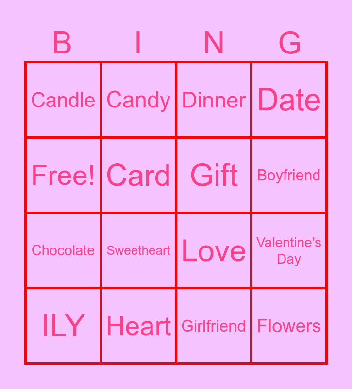 This bingo card has 16 words: Heart, Valentine's Day, Dinner, Candle, Chocolate, Candy, Love, Girlfriend, Free!, Card, ILY, Date, Sweetheart, Boyfriend, Gift and Flowers.