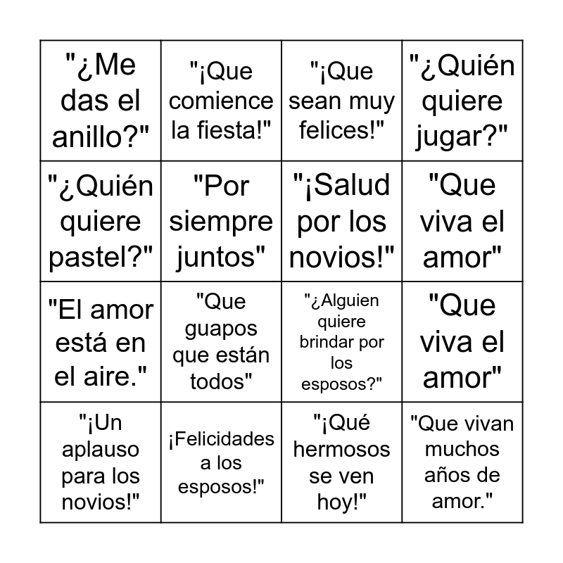 This bingo card has 16 words: ¡Felicidades a los esposos!", "Que viva el amor", "¡Que sean muy felices!", "¿Me das el anillo?", "El amor está en el aire.", "¡Que comience la fiesta!", "¿Alguien quiere brindar por los esposos?", "¡Qué hermosos se ven hoy!", "¿Quién quiere pastel?", "Por siempre juntos", "¡Un aplauso para los novios!", "¿Quién quiere jugar?", "Que guapos que están todos", "Que viva el amor", "¡Salud por los novios!" and "Que vivan muchos años de amor.".