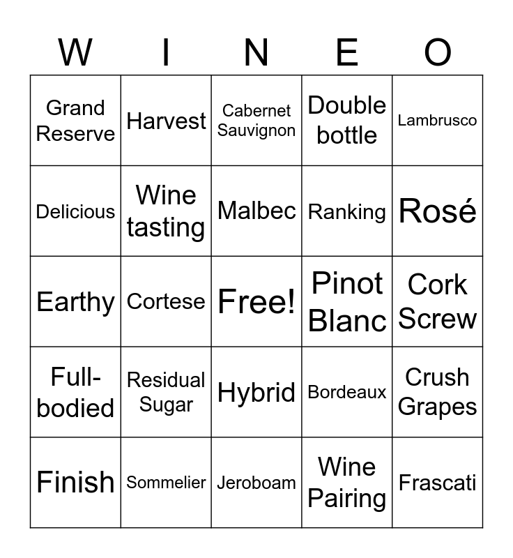 This bingo card has a free space and 57 words: Extraction, Finish, Fruity, Grand Reserve, Jeroboam, Vinology, Wine tasting, Yield, Ranking, Observation, Double bottle, Hungover, Girls night, No thank you, Riesling, Marsala, Lambrusco, Cortese, Syrah, Frascati, Pinot Blanc, Grappa, Bordeaux, Cabernet Sauvignon, Pinot Gris, Malbec, Sauvignon Blanc, Bardolino, Rosé, Pinot Grigio, Gamay, Sherry, Cheers!, Wine Opener, Cork Screw, Delicious, Color, Earthy, Fermentation, Full-bodied, Harvest, Hybrid, New World Wine, Oaky, Oxidized, pH levels, Residual Sugar, Sommelier, Secondary fermentation, Small lot, Wine glass, Wine Pairing, Bottle Age, Box Wine, Cold fermentation, Crush Grapes and Decanting.