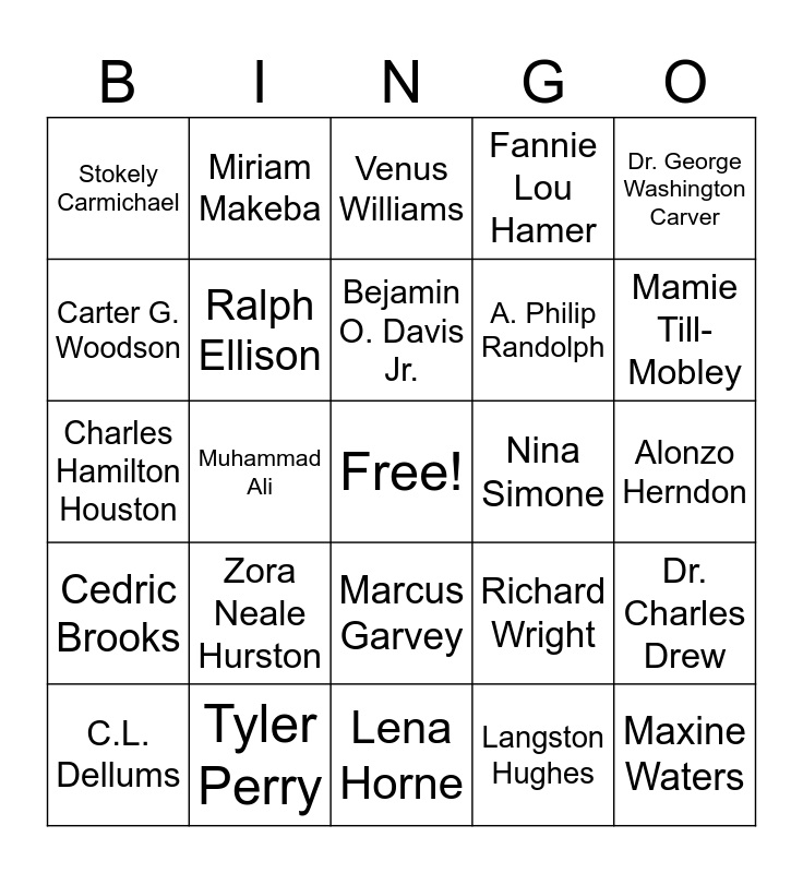 This bingo card has a free space and 97 words: Kareem Abdul-Jabbar, Ralph Abernathy, Alvin Ailey, Muhammad Ali, Maya Angelou, Louis Armstrong, Erykah Badu, Ella Baker, James Baldwin, Harry Belafonte, Derrick Bell, Beyonce, Dorothy Lee Bolden, Cedric Brooks, Gwendolyn Brooks, Stokely Carmichael, Dr. George Washington Carver, Shirley Chisholm, Lucille Clifton, Bessie Coleman, Claudette Colvin, John Conyers Jr., Dorothy Cotton, Angela Davis, David Dinkins, Bejamin O. Davis Jr., C.L. Dellums, Dr. Charles Drew, W.E.B Du Bois, Marian Wright Edelman, Ralph Ellison, Fannie Lou Hamer, Patricia Roberts Harris, Ben Hooks, Lena Horne, Marcus Garvey, Henry Louis Gates Jr., Earl Graves Sr., Dr. Dorothy Height, Charles Hamilton Houston, William H. Hastie, Alonzo Herndon, Bejamin Hooks, Langston Hughes, Zora Neale Hurston, Janet Jackson, Travis Jackson, Bob Johnson, James Weldon Johnson, Claudia Jones, Mother Jones, Barbara Jordan, Colin Kaepernick, Coretta Scott King, Dr. Martin Luther King Jr., John Lewis, Reginald F. Lewis, Miriam Makeba, Thurgood Marshall, Floyd McKissick, Kweisi Mfume, Isaiah T. Montgomery, Toni Morrison, Constance Baker Motley, Huey P. Newton, Barack Obama, Michelle Obama, Jesse Owens, Rosa Parks, Tyler Perry, A. Philip Randolph, Walter Reuther, Paul Robeson, Jackie Robinson, Bayard Rustin, Angela Rye, Bobby Seale, Al Sharpton, Nina Simone, Maceo snipes, Wanda Sykes, Mamie Till-Mobley, Kwame Ture, Reginald F. Lewis, Alice Walker, Maggie Lena Walker, Maxine Waters, Faye Wattleton, Denzel Washington, Serena Williams, Venus Williams, August Wilson, Oprah Winfrey, Richard Wright, Carter G. Woodson, Andrew Young and Aretha Franklin.