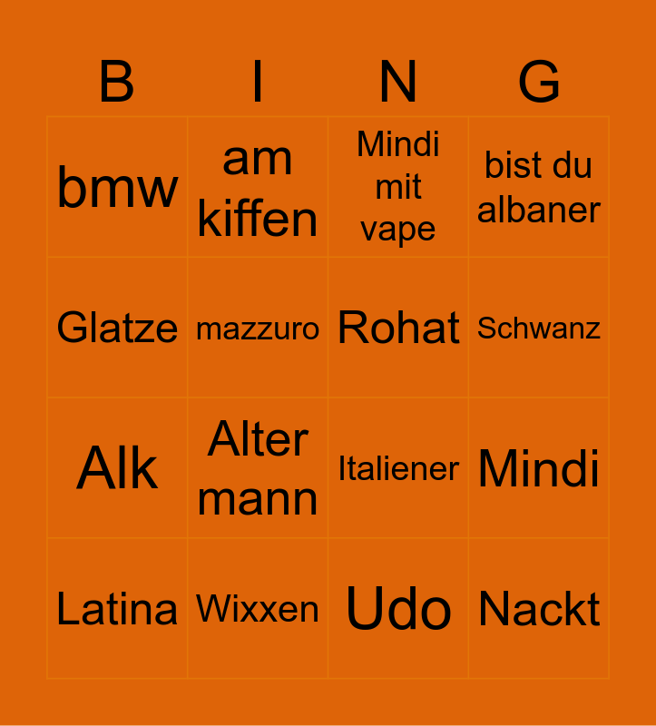 This bingo card has 16 words: Wixxen, Mindi, Mindi mit vape, bmw, Alk, am kiffen, Italiener, Udo, Glatze, mazzuro, Latina, bist du albaner, Alter mann, Schwanz, Rohat and Nackt.