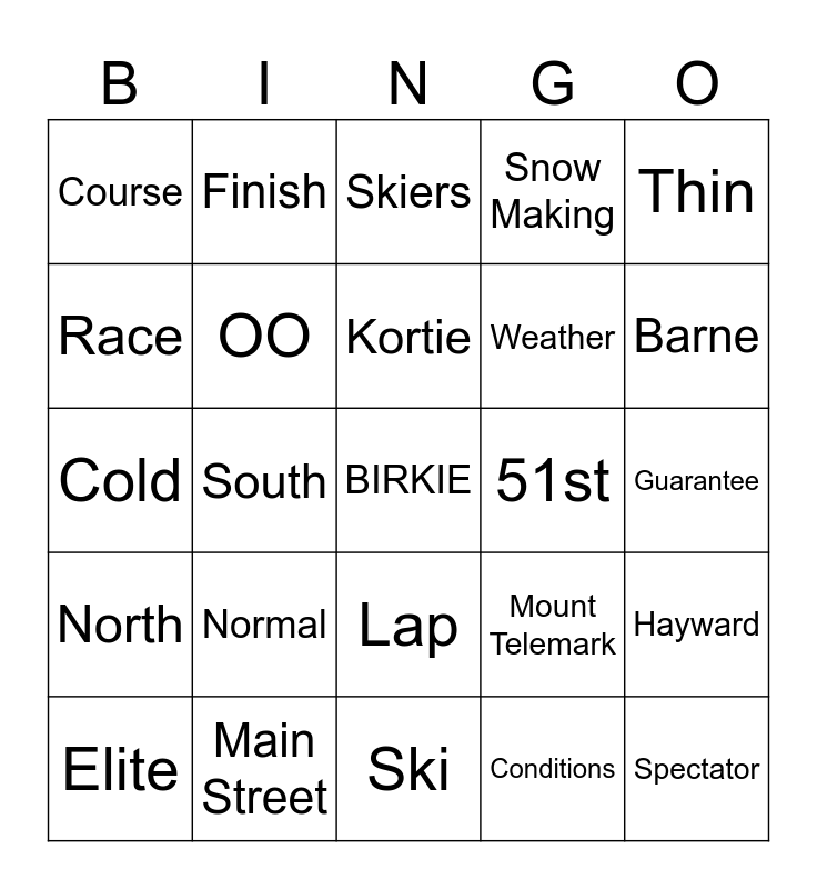 This bingo card has a free space and 40 words: Snow, Cold, Warm, OO, Main Street, Lap, Kortie, Prine Haakon, Thin, North, South, Snow Making, Spectator, Guarantee, 51st, Normal, Information, Course, Hatchery, Skiers, Hayward, Conditions, Weather, Race, Skate, Cable, Ice, Classic, Lake, Safe, Wave, Elite, Time, Mount Telemark, Barne, Ski, Event, Start, Finish and Loop.
