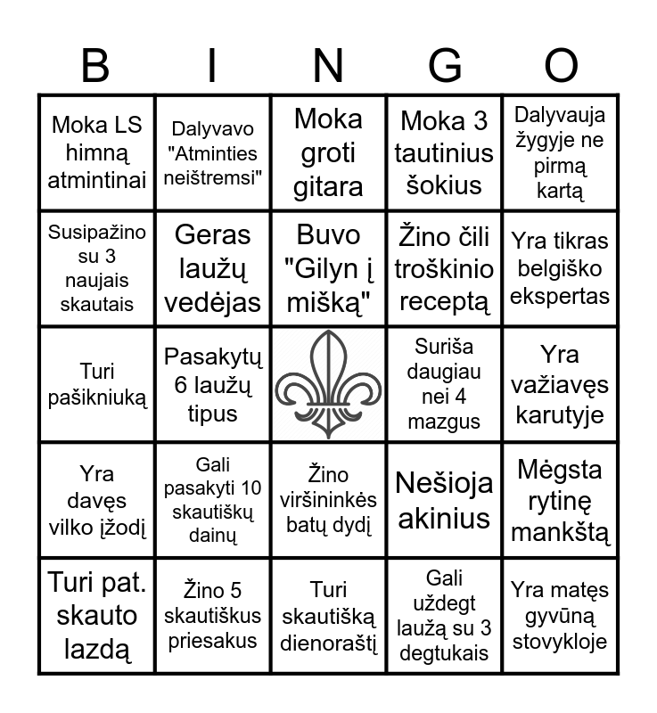 This bingo card has a free space and 24 words: Gali pasakyti 10 skautiškų dainų, Žino 5 skautiškus priesakus, Buvo "Gilyn į mišką", Turi pat. skauto lazdą, Dalyvauja žygyje ne pirmą kartą, Moka LS himną atmintinai, Susipažino su 3 naujais skautais, Dalyvavo "Atminties neištremsi", Suriša daugiau nei 4 mazgus, Žino viršininkės batų dydį, Žino čili troškinio receptą, Turi pašikniuką, Nešioja akinius, Mėgsta rytinę mankštą, Geras laužų vedėjas, Gali uždegt laužą su 3 degtukais, Yra važiavęs karutyje, Moka groti gitara, Yra tikras belgiško ekspertas, Pasakytų 6 laužų tipus, Yra matęs gyvūną stovykloje, Yra davęs vilko įžodį, Moka 3 tautinius šokius and Turi skautišką dienoraštį.
