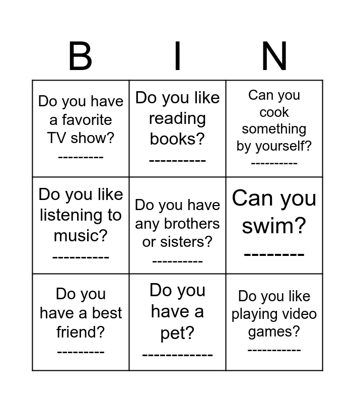 This bingo card has a free space and 11 words: Can you play a musical instrument? ----------, Do you have a pet? ------------, Do you like playing video games? -----------, Do you have a best friend? ---------, Do you like reading books? ----------, Can you cook something by yourself? ----------, Can you swim? --------, Do you like pizza? --------, Do you like listening to music? ----------, Do you have a favorite TV show? --------- and What is your favorite hobby? ---------.