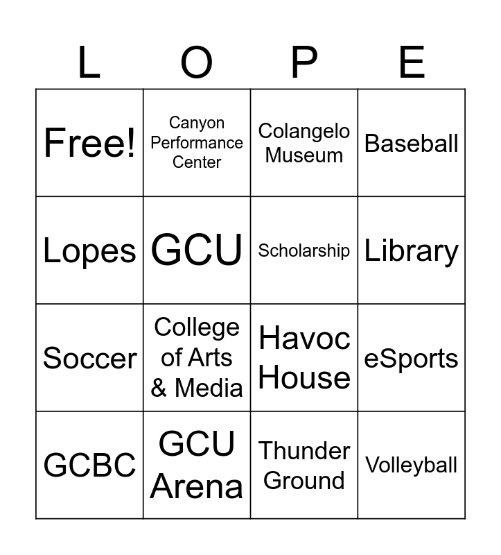 This bingo card has 16 words: GCBC, GCU Arena, Colangelo Museum, Baseball, Lopes, Canyon Performance Center, Havoc House, eSports, Free!, GCU, Thunder Ground, Library, Soccer, College of Arts & Media, Scholarship and Volleyball.