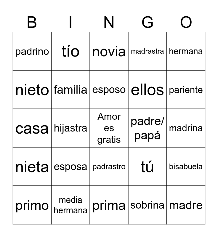 This bingo card has a free space and 37 words: abuelo, abuela, bebé, familia, bisabuela, esposa, esposo, hermano, hermana, hijastro, hijastra, madrastra, madre, madrina, nieto, nieta, novio, novia, padrastro, padre/ papá, padrino, pariente, primo, prima, sobrino, sobrina, tío, tía, perro, gato, medio hermano, media hermana, casa, bisabuelo, tú, ellos and nosotros.